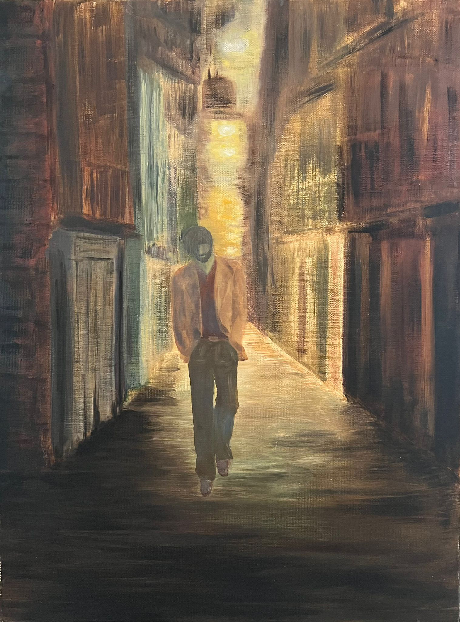 Il avance sans savoir si la rue le mène ou le retient. Les murs respirent, la lumière s’éteint puis revient, sans ordre. Le pas hésite, le regard s’efface, ou peut-être l’inverse. Tout semble partir d’ici, ou finir ailleurs.
